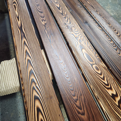 Vores unikke teknik indebærer at forkulle træet med ild og derefter tilføje en særlig finish. Det skaber en enestående overflade, som fremhæver træets naturlige åremønster, struktur, farve og tekstur.